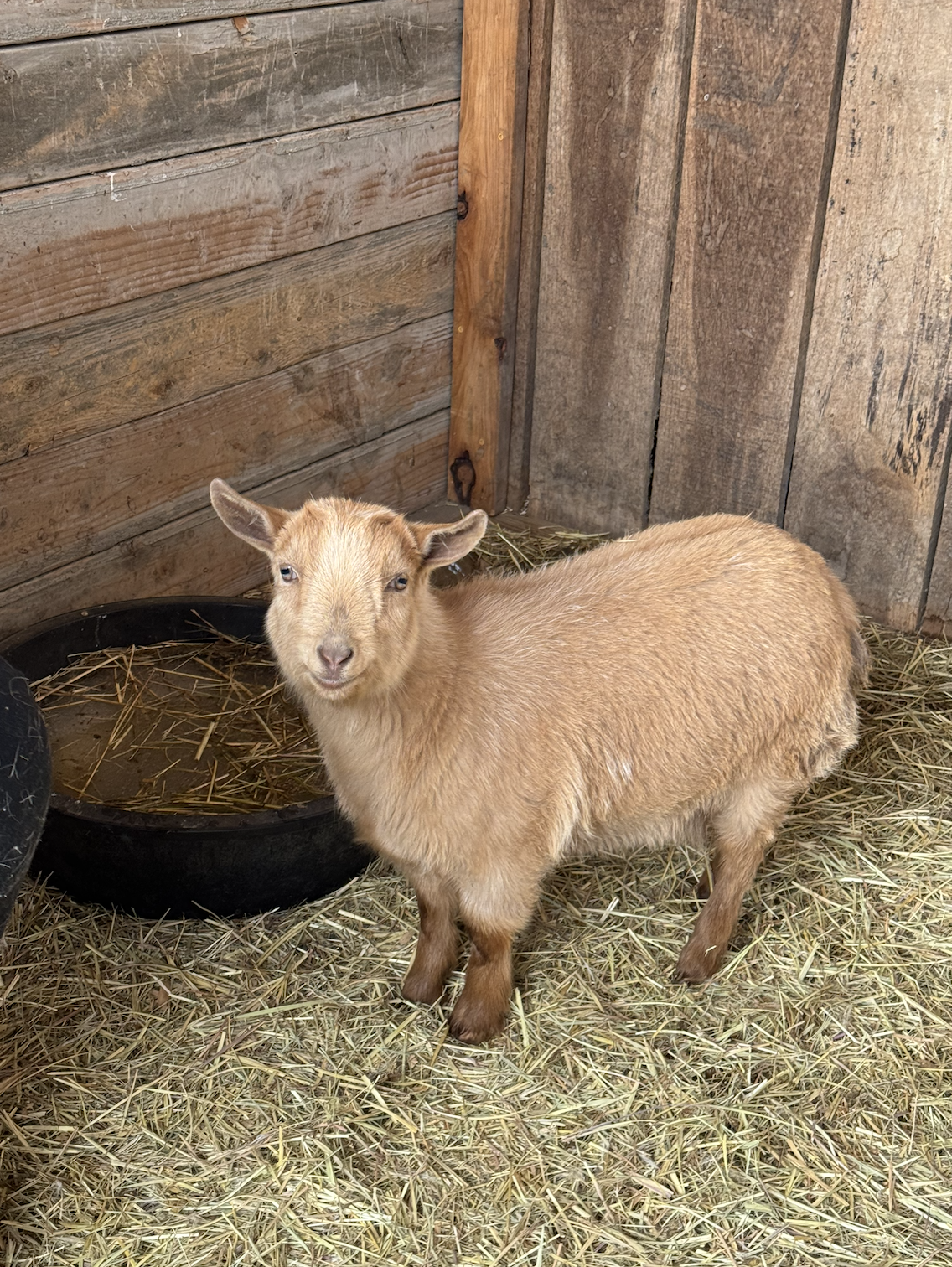 Butterscotch is a bright, affectionate Nigerian Dwarf doeling raised with thoughtful care and consistent human interaction. Accustomed to the rhythms of farm life, she is fully weaned and thriving on grain and hay. With her charming presence and gentle nature, Butterscotch will receive her first round of CD&T vaccination prior to departure and is an excellent addition for those looking to build a healthy, happy herd.